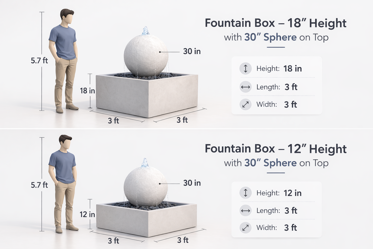 Custom handmade sphere fountain. Choose your preferred color and base to match your space. Perfect for modern outdoor designs.